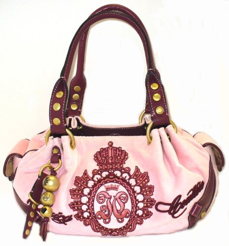 Juicy Couture Baby Fluffy Hobo Medium Shoulder Bag. Light pink terry cloth. Crowned's signature "JC" medallion with brass rivets and embroidered Juicy logo beads hanging off the bag. Burgundy leather shoulder straps and accented with brass hardware trim. Convenient magnetic closure for easy access to main compartment. Two side pockets for additional storage. Signature cotton fabric lined interior with handy mobile phone pocket holder. Burgundy Embroidered Juicy Couture's signature on the front of the bag. Back pocket has leather "J" heart. This hobo bag has tasty terry velvet, whimsical logo beads hanging with all the details that make this Juicy bag the perfect choice for everyday use.